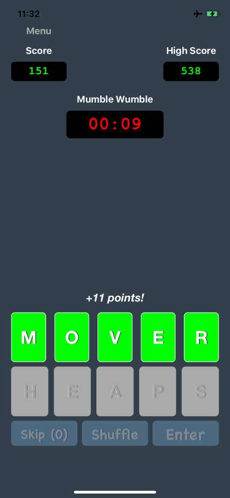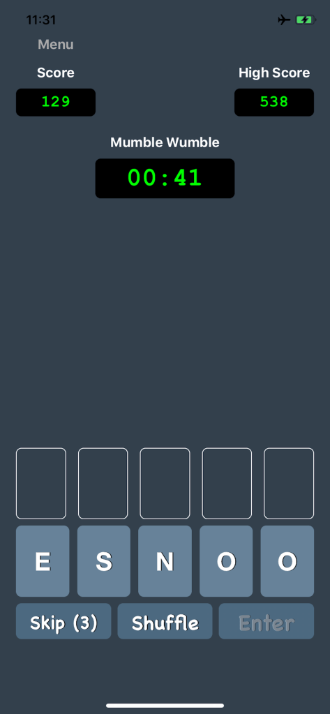 Reasons why you should play Mumble Wumble right now:1. Game play is simple, yet addictively fun!2. With over 1100 words, exercise your brain, test your wits and expand your vocabulary.3. Prove to the world you are the master of 5 letter word anagrams by getting your high score on our global leaderboard.4. Mumble Wumble is word puzzles at its finest. This game was created because it’s something I was looking for but couldn’t find. I hope you have as much fun playing it as I did creating it.